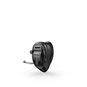 Custom hearing aids that are partially visible in the outer ear.
